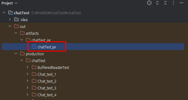 - D:\IntelliJ\chatTest\chatTest\out\artifacts\chatTest_jar\chatTest.jar : JAR 파일 경로\JAR파일