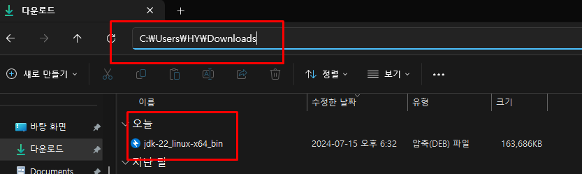 - C:\Users\HY\Downloads\jdk-22_linux-x64_bin.deb" : 보낼 파일 경로\ 보낼 파일