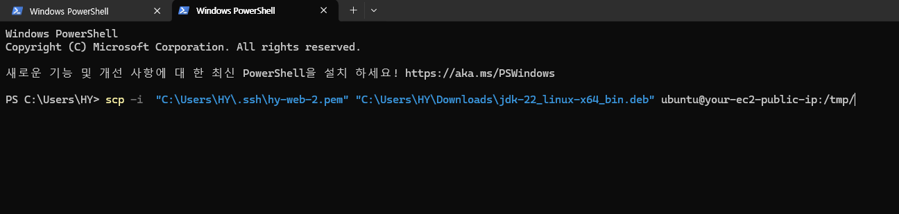 scp -i "C:\Users\HY\.ssh\hy-web-2.pem" "C:\Users\HY\Downloads\jdk-22_linux-x64_bin.deb" ubuntu@your-ec2-public-ip:/tmp/